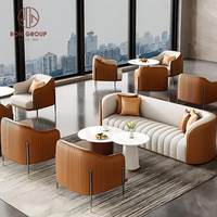 レストラン家具セット茶色と白革の湾曲したソファシングルチェアと大理石の丸いコーヒーテーブルカフェ用